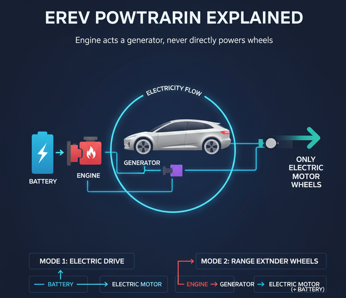 EREV는 쉽게 말해 "전기로 달리지만, 배터리가 부족하면 엔진이 발전기처럼 작동하여 전기를 만들어내 주행거리를 늘려주는 전기차"입니다.